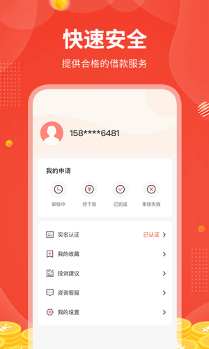 1、快速放款:按照步骤提交申请,后台智能审批,极速到账;