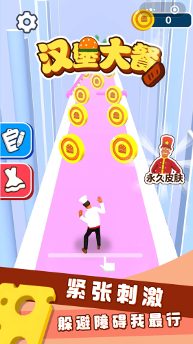 碰到障碍物会导致部分汉堡掉落,还有个小惊喜告诉你,路上的金币是可以搜集的哦,金币到达一定数量,可购买你心仪的皮肤呀!