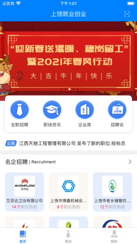 上饶就业创业app是一款本地照片求职服务平台,用户可以通过上饶就业创业app了解本地企业招聘情况,app提供招聘会,职场资讯,企业库等功能。