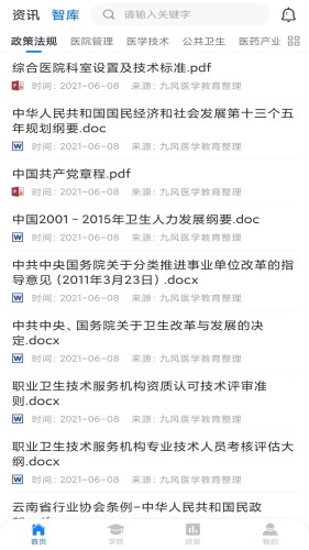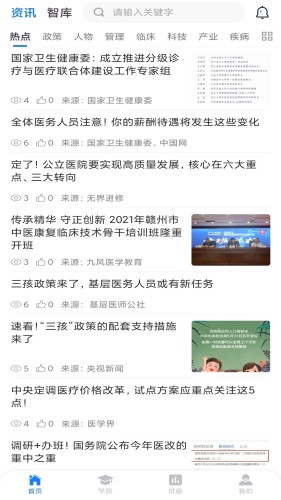 主要包括管理、临床、考试、通识学院和学习书籍、线上直播等,用户通过点击分类,可查看各细分类目下相关视频列表、书籍页详情和个人学习情况排名。
