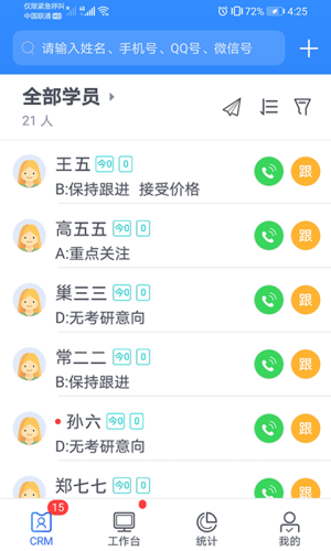 学员通支持文件、图片和音频随时录入准学员的情况,快速、及时、记录提交内容,同时可自定义跟进记录和标签,随时标记进程,标记专属标签,让管理更方便。同时支持手机一键直拨通话。