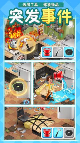 3、欢迎来到倒霉先生的庄园,帮助小老弟避开造成危险的选项,选择正确的道具对庄园内的设置进行修补,慢慢解锁庄园全貌,一起打造独一无二的欢乐世外桃源吧!