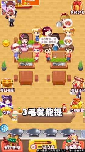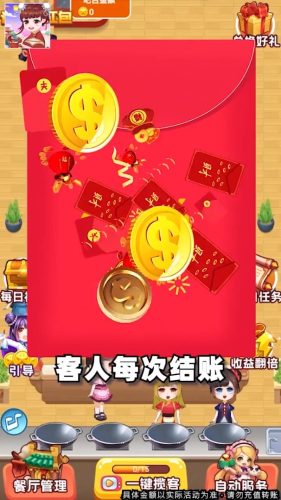 欢乐中餐厅的红包版本来了,这个好玩的美食经营游戏,为玩家们提供现金红包的福利,每次升级食物或者餐厅,都可以拿到红包哦,而且看广告能够增加这里面的金额,千万要来试一试。