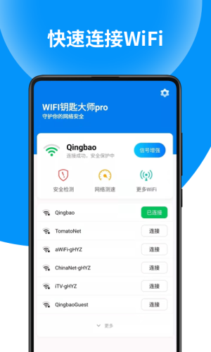WIFI钥匙大师pro是一款非常实用的wifi管理服务软件,软件功能非常强大,这里提供免费连接、网络检测、防止蹭网等多功能,操作便捷,能够让你上网更安全,有需要的朋友快来下载吧!