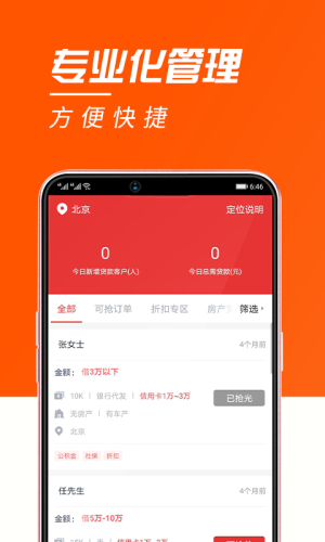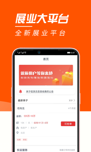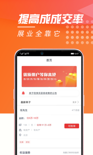 整合信贷圈行业资源,一手实时优质单,海量用户,实时更新抢单资源,降低信贷员、信贷经理们的获客、成单成本,