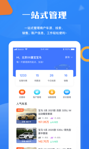 【一站式管理】一站式管理商户车源、线索、销售、账户信息,工作轻松便利。