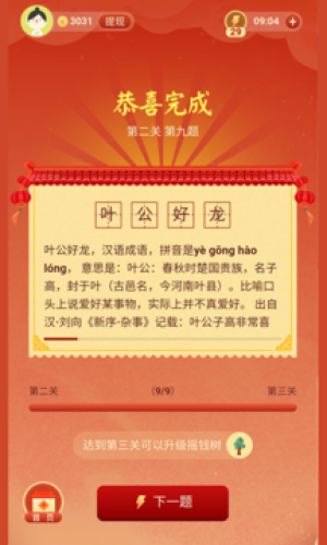 2、在尝试每个关卡我们其实是能够去进行观察的,这样也是能够去了解之前学习过的成语,遇到不熟悉的是能够去上网查看。
