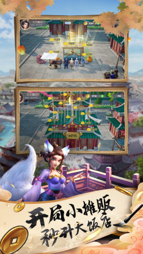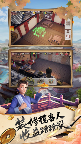 6、初入游戏,玩家将扮演一个客栈掌柜开始白手起家,随着财力日益增强,杂货铺、驿站、酒楼、布坊、乐坊……将随之开启。