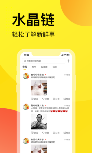 水晶链app是一款分享社交软件平台,用户可以通过水晶链app了解到别人发布的热点动态,也可以通过加好友的方式进行在线交流,使用非常的方便。