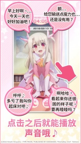 魔法少女:伊利雅闹钟中文版app是一款让可爱的伊莉雅每天喊你起床的闹钟应用,玩家将拥有自己的私人语音闹铃,萌萌的伊莉雅每天早晨都会用不同的声音叫主人起床,超人气TV动画【魔法少女☆伊莉雅】已经出到第四季,官方APP伊莉雅闹钟终于登场了!