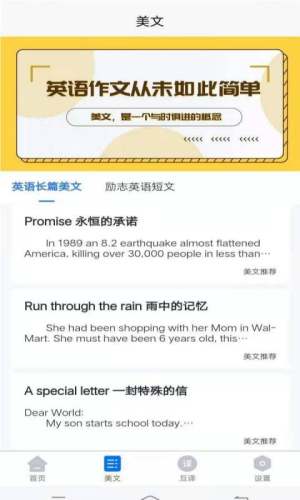帮助学生们在这里来学习英语作文的写法,也是非常靠谱的移动端英语作文辅导平台,这里有各种各样的精选范文,也可以帮助学生们在线上来轻松学习,海量英语作文丰富,不同类型的范文都可以在这里搜索,还可以帮助学生们来提高英语写作方面的技巧。