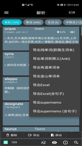 3、支持将提取出的生词,导出为生词本,从而利用流行的记单词软件(有道,金山, anki 生词本等)随时随地记单词。