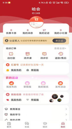 3、我的页面中,是个人信息、我的消息、我的足迹、培训订单、红星号、我的学习、我的点赞等功能展示。
