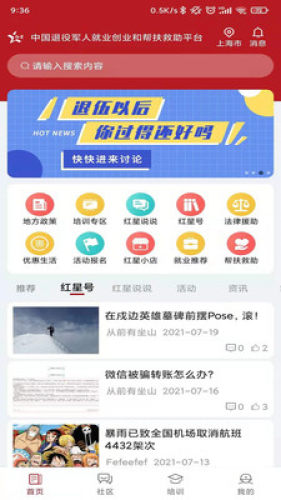 红星网app,退役军人就业、创业、帮扶平台,汇聚最新资讯信息,提供优质培训课程,发布最新政策,内容丰富,解决用户就业创业难题。