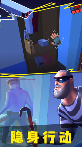 休闲模拟游戏,玩家将会从一名菜鸟开始慢慢学会盗窃技巧,成为真正的神偷,偷盗的东西可以用来卖出大量的金钱,让你轻松发家致富。每一次成功通关都能给玩家带来成为法外狂徒和挑战法律的满足感。