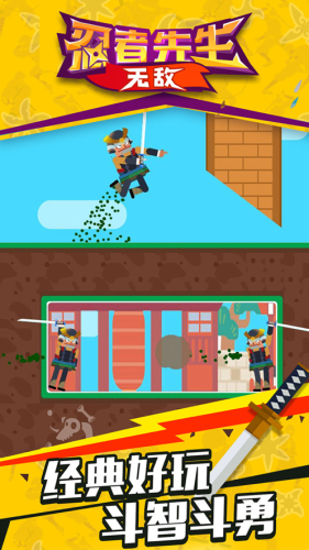 5、这是一款有趣的切割类休闲游戏,游戏画风简洁别具一格,以忍者为游戏题材。游戏中玩家需要运用手中的剑发挥自己强大的忍术将前面的地形给切开破坏,并且使得对面的敌人掉落平台或者死于你的刀下。