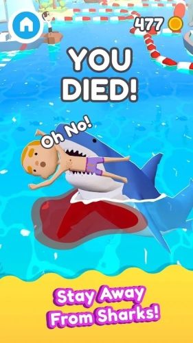 鲨鱼逃生3D游戏是一款非常刺激的游泳比赛游戏,游戏中玩家可以选择不同的角色来进行一场刺激的游泳比赛,比赛中玩家会碰到非常多的障碍物以及危险的鲨鱼,玩家需要躲避危险来顺利到达终点。