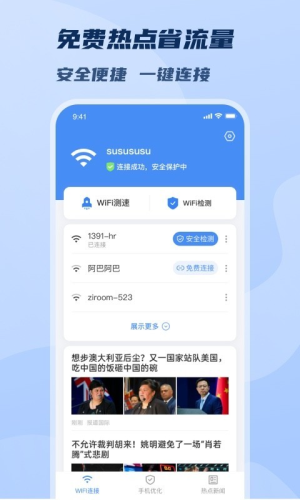 安全WiFi热点连接,省时省力。内存小,省流量,稳定便捷,无论在何地,轻松一键,秒连接。