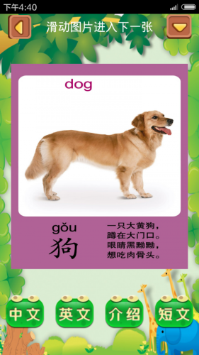 2、还有中文,英文,介绍等,非常适合宝宝学习动物。在练习模块里还会随机出现之前学过的动物,加深印象