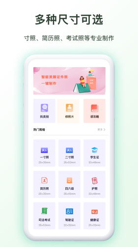 支持各种尺寸证件照制作,各类考试照、头像照、学生证、工作证、护照、报名考试照等,满足您各种应用场景需求