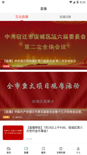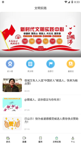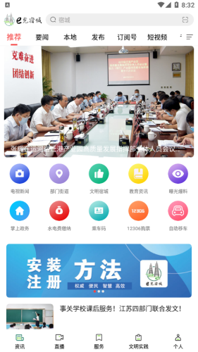 e览宿城app是专为宿城制作的融媒体平台,平台拥有资讯,直播,服务,文明实践,个人等等内容板块,可以帮助更好的引导及服务宿城。