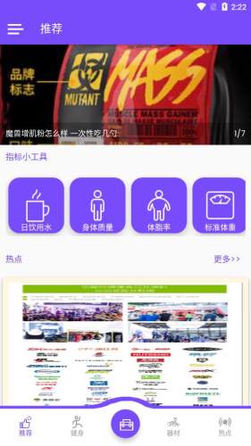 2、使用实用的健身小工具:每天该和喝多少水、每天该摄入多少蛋白质、标准体重是多少、最佳身材是怎样,在这里都能为您科学准确的计算;