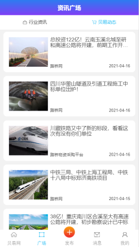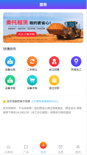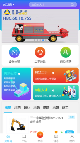 贝易网App,提供了设备出租、二手转让、岗位招聘等功能,专为基建行业打造的信息撮合服务平台,您可以发布信息,也可以在广场中寻找机会哦。