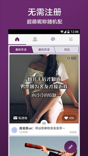 耳语是一款基于陌生人私密交友的应用,加入耳语,无需注册登录,没有人知道你是谁,私密聊天,想聊就聊,分享你的开心与不快。匿名聊天、同城附近热聊交友、校园群组任意玩,耳语,最隐秘最好玩的陌生人交友应用。