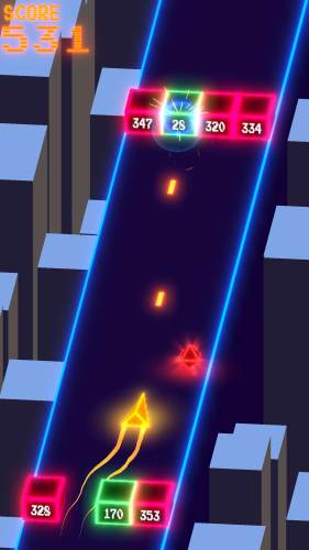 几何驱逐舰是一款非常简单的游戏,游戏中你操控的几何战舰正在不断地前行,但是一路上会有很多的彩色小方块,你可以发射子弹将他们击碎,每个砖块的强度不一样的哦。