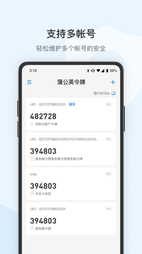 蒲公英令牌app,时刻保证您的账号信息安全;保证您的帐号安全,配合蒲公英帐号登录安全的两步验证;无需登录,打开应用后可直接添加令牌码;支持多帐号,轻松维护多个帐号的安全;基于时间生成验证码,每30s更新一次验证码。