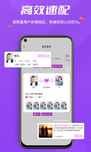 【高效速配】 根据位置、年龄、身高、三观性格、兴趣爱好、房车户籍等要求,助你快速找到心仪的她(他)。