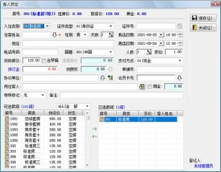 操作方法二:选择客人要预定的其中一个房间→单击菜单栏上的[预定接待]→出现下拉菜单→选择[客人预定]菜单项→出现[客人预定]窗口)→输入客人的信息后,在可选房间中双击需要同时预定的其他房间→确定保存后即可完成操作。
