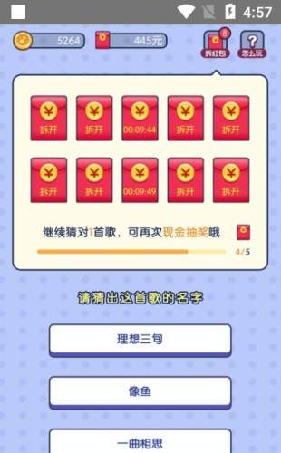 2.玩家可以通过猜歌、拆红包、做任务等方式获取金币奖励,当金币累积到一定数量可以兑换现金