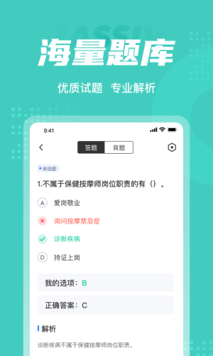 保健按摩师题库内含考点练习,全国通用卷以及地区卷模拟练习,以及按照固定考试比重的随机式的抽题的真题考场,成绩单实时记录考试数据,一点一滴的反馈考生近期学习状态以及自我正确率的提升,大大的给予考生通过考试的信心。