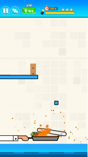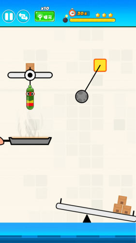 3、非常魔性的物理解谜游戏,使用平顶锅做煎饼,玩家观察游戏界面,割断香蕉的绳子,让摇摆的香蕉顺利掉进平顶锅。