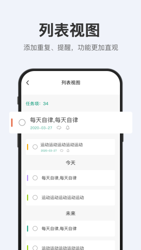 拾趣清单app,遇见美好时光;列表视图,添加重复、提醒,功能更加直观;周视图,每日清单,清楚查看,方便记录;时间轴,按照时间把清单串联起来,方便回忆;日历视图,每月的清单都统计起来,方便查看;四象限,事件重要紧急情况分四象限,提高效率。