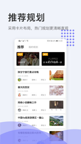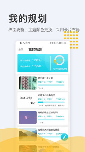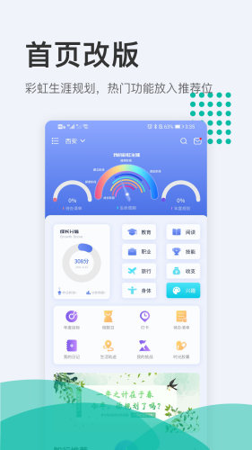 拾趣规划app,规划自己的生活;首页改版,彩虹生涯规划,热门功能放入推荐位;推荐规划,采用卡片布局,热门规划更清晰直观;我的规划,界面更新,主题颜色更换,采用卡片布局;动态故事,实时更新用户每一条动态故事,更清晰。