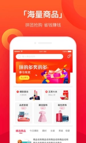 1、海量商品,拼团抢购,省钱赚钱,购物轻松;