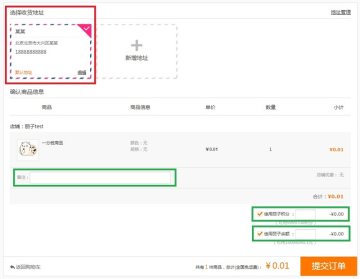 第四步:选择正确的收货地址(红色框内容,为必选项,不操作则系统选择默认地址),其中备注、使用丽子积分、使用丽子余额为可选项(绿色框内容,不操作则系统默认为不填写/不勾选),以上信息确认无误后,点击提交订单,如下图示: