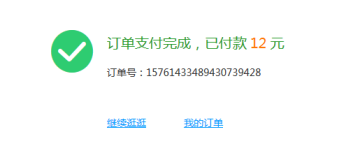 第六步:若出现如下页面,那么恭喜您,购物成功啦,您可以选择继续逛逛(回到首页)或查看我的订单(进入我的订单页面)