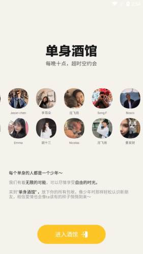单身酒馆app是一款十分实用的社交聊天软件。这是一家可以装进口袋的酒馆,欢迎单身还有少年感的你~我们有酒更有故事,每晚十点准时营业,希望你能尽情享受自由的时光,也能遇到美好爱情。