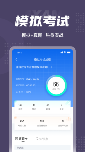 健身教练资格证题库内含考点练习,全国通用卷以及地区卷模拟练习,以及按照固定考试比重的随机式的抽题的真题考场,成绩单实时记录考试数据,一点一滴的反馈考生近期学习状态以及自我正确率的提升,大大的给予考生通过考试的信心。