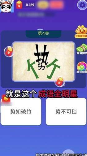 1、答对一个成语≈0.3元,3毛就能提现,不赚白不赚