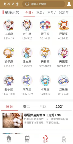 每日运势结合个人生辰八字信息,打造专属个人的生肖以及星座运势。