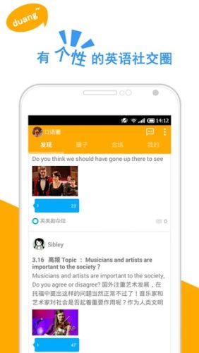 口语圈是一款好玩实用的英语口语学习软件,将口语练习学习与社交功能结合,开创一种全新的学习模式,让你体验社交功能的同时也能将英语口语练好。你可以加入到自己感兴趣的话题圈中,和大家一同学习练习口语,共同进步。