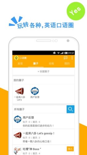 口语圈由日常口语、商务口语、雅思口语、托福口语这四个版块构成,每个版块下都有相关话题圈。只要你是口语圈的用户,你就具备创建圈子的权利!圈子的范围会随着口语圈的成长而壮大。用户既能感受到在圈主带领下的浓厚学习氛围,也能在公共圈自由发挥。