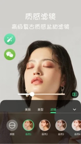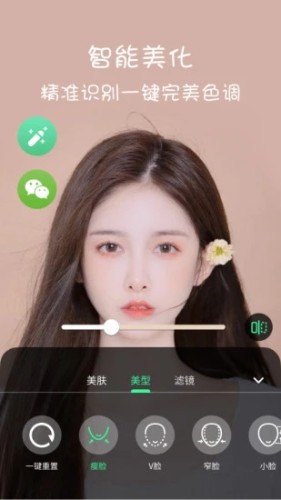 瘦脸瘦身:v脸、窄脸、小脸、瘦脸、大眼、眼距、瘦颧骨、长鼻、嘴形、微信唇形、缩人中、下巴额头均已按照自己所需来调整,一键设置,网红小仙女姐姐都在用滤镜加持:港风、小清新、、质感、自然各类滤镜风格可挑选。