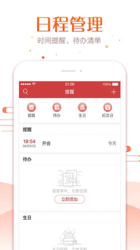 ②提醒:会议、记事、待办、日程管理、生日提醒、日记本;