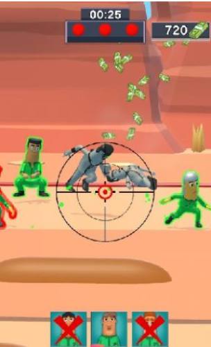 3、但是这一次你扮演的不是参赛者,而是“木头人”,你要在规定的时间内找到那些犯规的人,并进行瞄准射击。