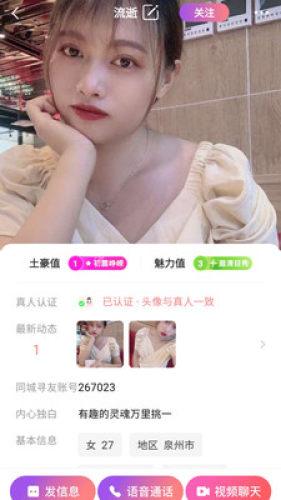 同城寻友是一款1v1视频交友软件,是一个轻松、有趣的交友平台。产品玩法丰富,可以通过文字、语音、图片聊天,通过视频通话和语音通话交流,通过动态表达自己的心情。同时应用内有万圣节、双十一、新年等活动,有趣的体验,打造更贴近用户使用习惯的视频社交应用。